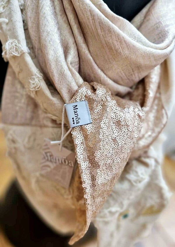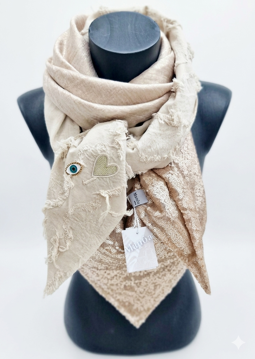 Ce modèle est un peu plus épais que les autres triangles proposés sur le site. Les sequins sont placés pour qu'ils ne soient pas en contact avec la peau.